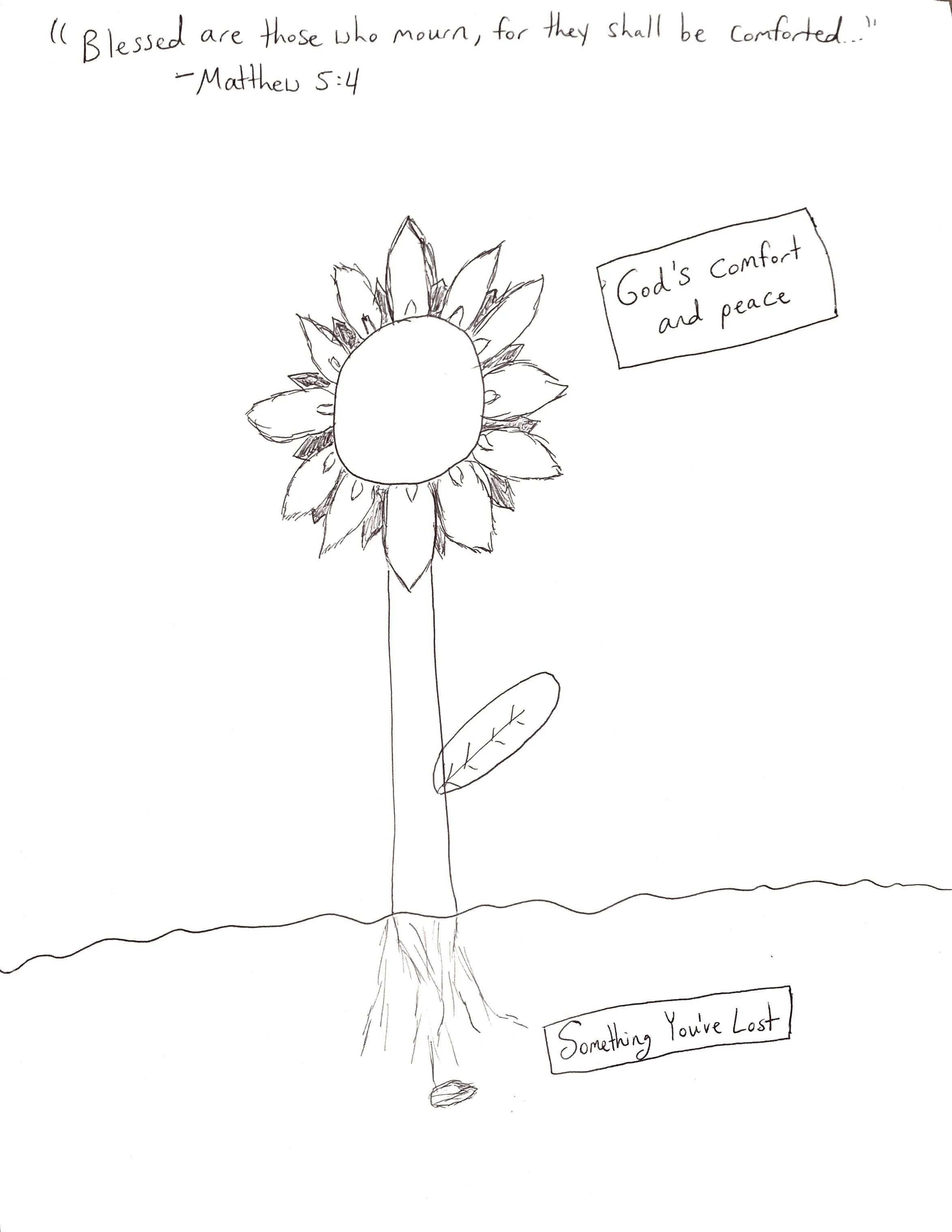 Remind your child that Jesus promises renewed comfort and peace through the losses they face, just as a beautiful sunflower grows from the burying of a seed. Assure your child that you care when they are sad, scared or upset and want to bring comfort to them in those times.